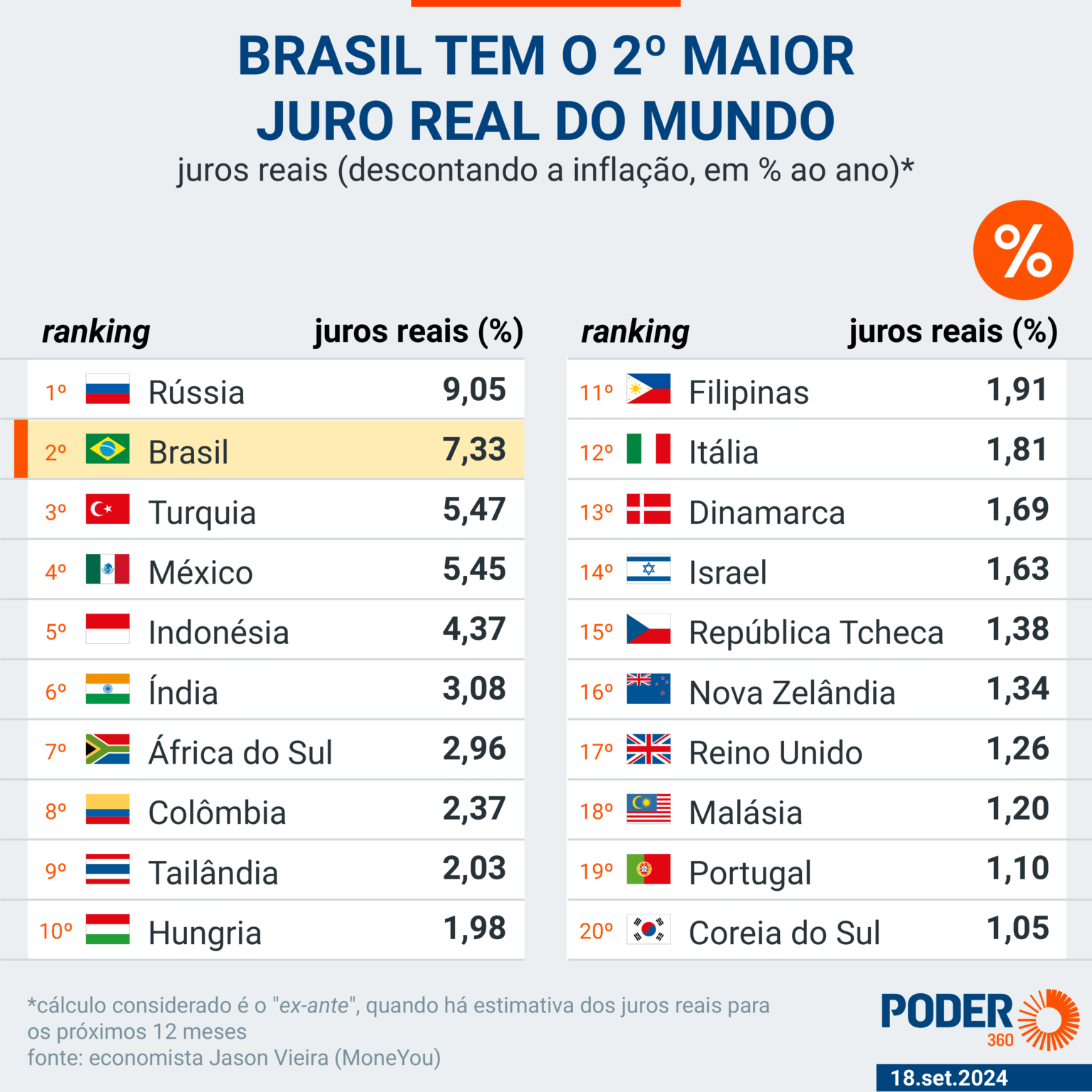 O Brasil ocupa a 2ª posição no ranking de maiores juros reais do mundo com a decisão desta 4ª feira (18.set). O levantamento do economista Jason Vieira mostra que a taxa “ex-ante”, aquela projetada para os próximos 12 meses, será de 7,33%. O país fica atrás só da Rússia, com 9,05%.