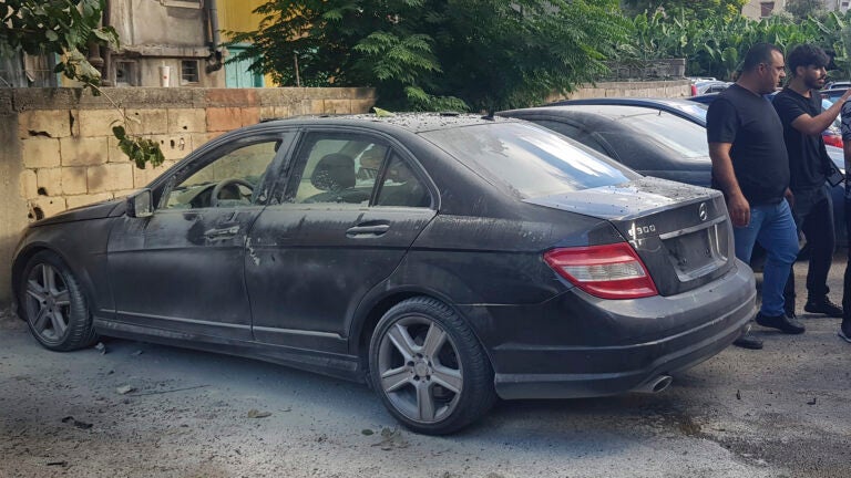 Agentes de segurança libaneses ao lado de um carro parcialmente danificado após o que se acredita ser o resultado da explosão de um walkie-talkie dentro dele, na cidade portuária de Sidon, no sul do Líbano, quarta-feira, 18 de setembro de 2024. AP Photo/Mohammed Zaatari