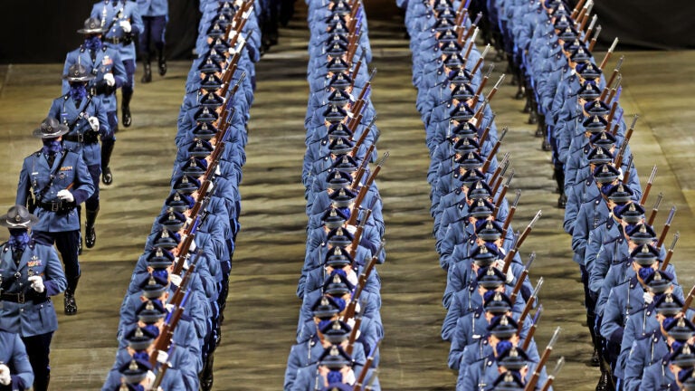 Estagiários da Polícia Estadual de Massachusetts marcham para uma cerimônia de formatura no DCU Center em Worcester em 2021, marcando a conclusão de seu treinamento na Academia de Polícia Estadual em New Braintree. David L Ryan/Boston Globe Staff, Arquivo