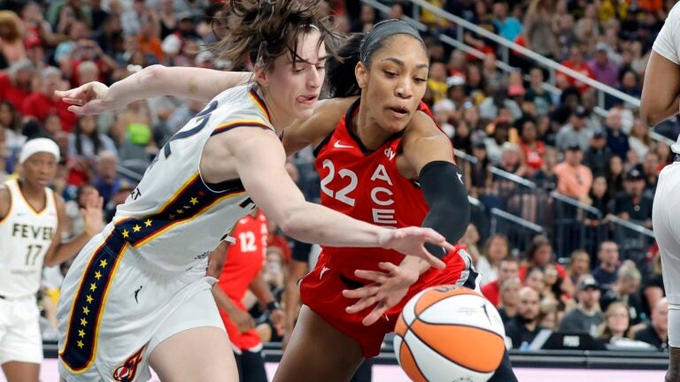 A armadora do Indiana Fever, Caitlin Clark, e a pivô do Las Vegas Aces, A’ja Wilson, correm atrás de um rebote. Steve Marcus/Las Vegas Sun via AP