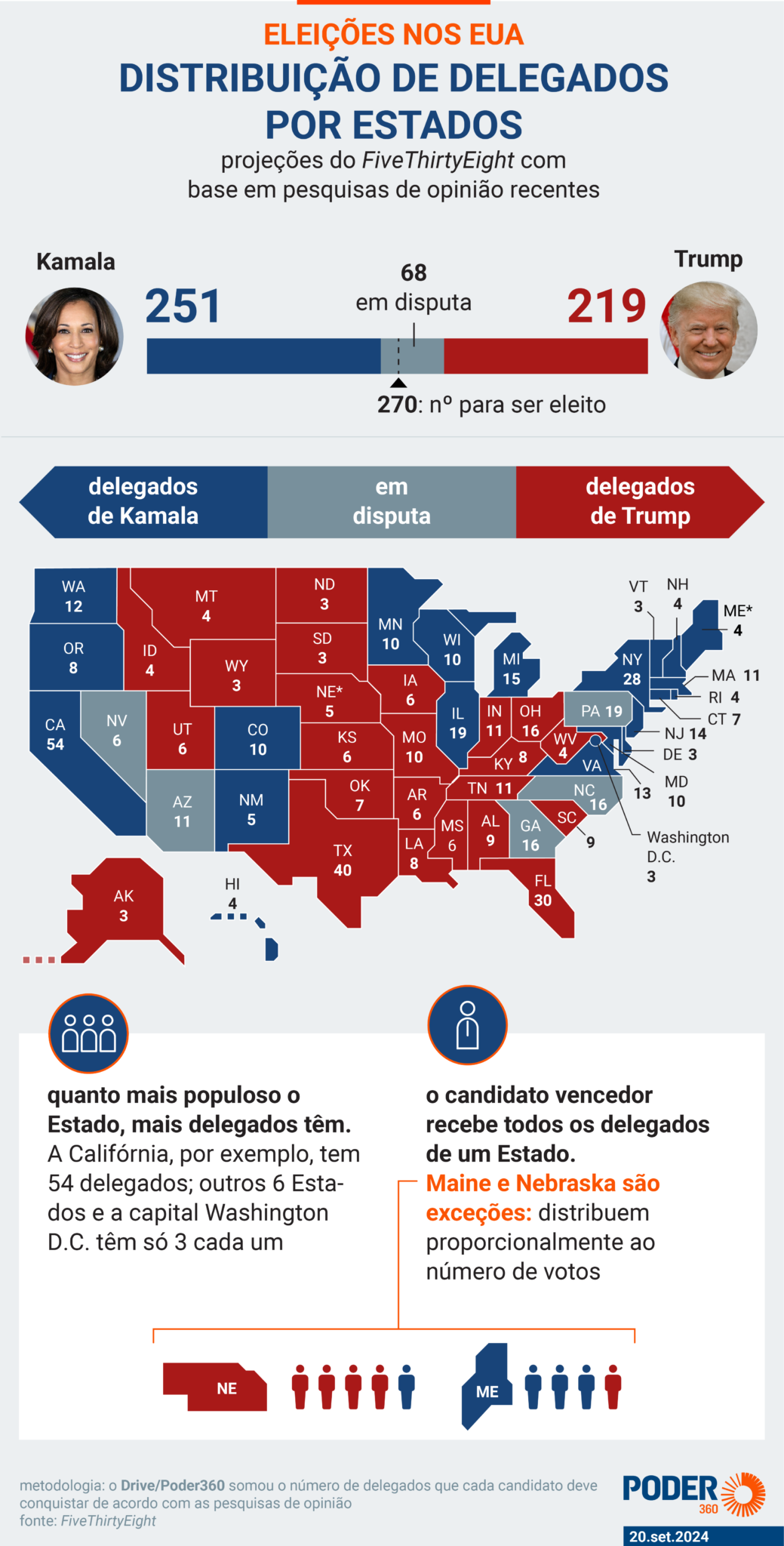 Maine e Nebraska adotam uma abordagem diferente e utilizam o método do distrito congressional: alocam 2 delegados para o vencedor do voto popular estadual e 1 para o vencedor em cada distrito (2 no Maine e 3 em Nebraska). Assim, o Estado pode ter disputas de voto popular e resultar em uma divisão dos votos eleitorais.