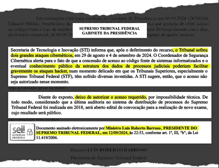 A concessão de acesso ao código-fonte de sistemas informatizados e o eventual conhecimento público da estrutura dos dados de processos judiciais poderiam facilitar gravemente os ataques hacker, num momento delicado.Barroso, em nova decisão