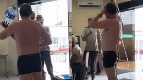 Um morador de Lavras , município de Minas Gerais , protagonizou um protesto inusitado na sede da Companhia de Saneamento de Minas Gerais (Copasa) , nesta terça-feira (24). Ele foi ao local e tomou banho, só de cueca, com um pequeno galão de água. A cena foi registrada por quem estava presente.