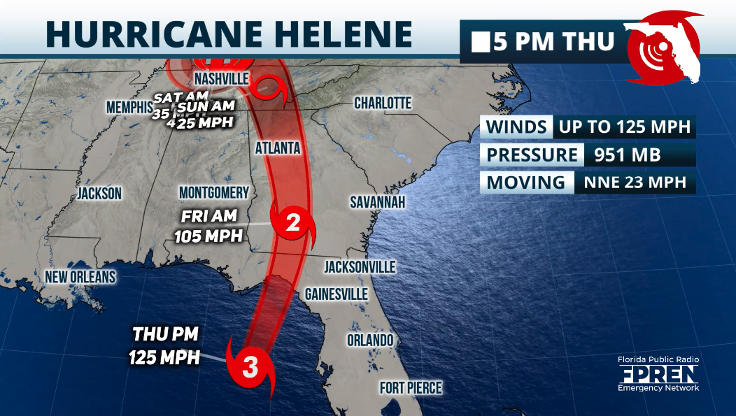 A partir das 18h, o Centro Nacional de Furacões disse que Helene mantinha ventos máximos sustentados de 130 mph e estava se movendo ainda mais rápido a 23 mph para norte-nordeste.