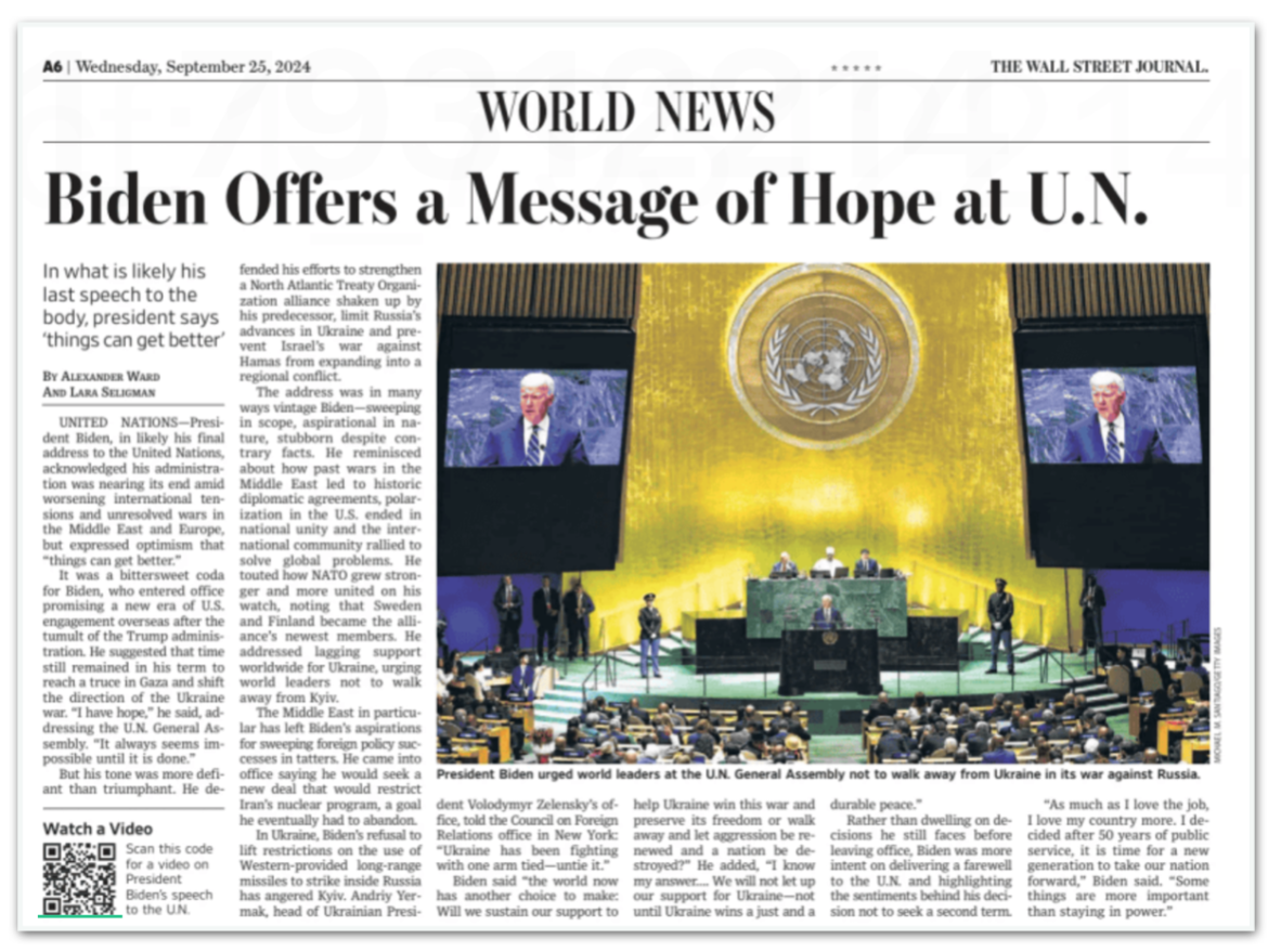 Wall Street Journal destacou que Biden disse que seu governo chega ao fim com o agravamento das tensões internacionais e guerras não resolvidas, mas que o presidente norte-americano expressou otimismo de que “as coisas podem melhorar”.