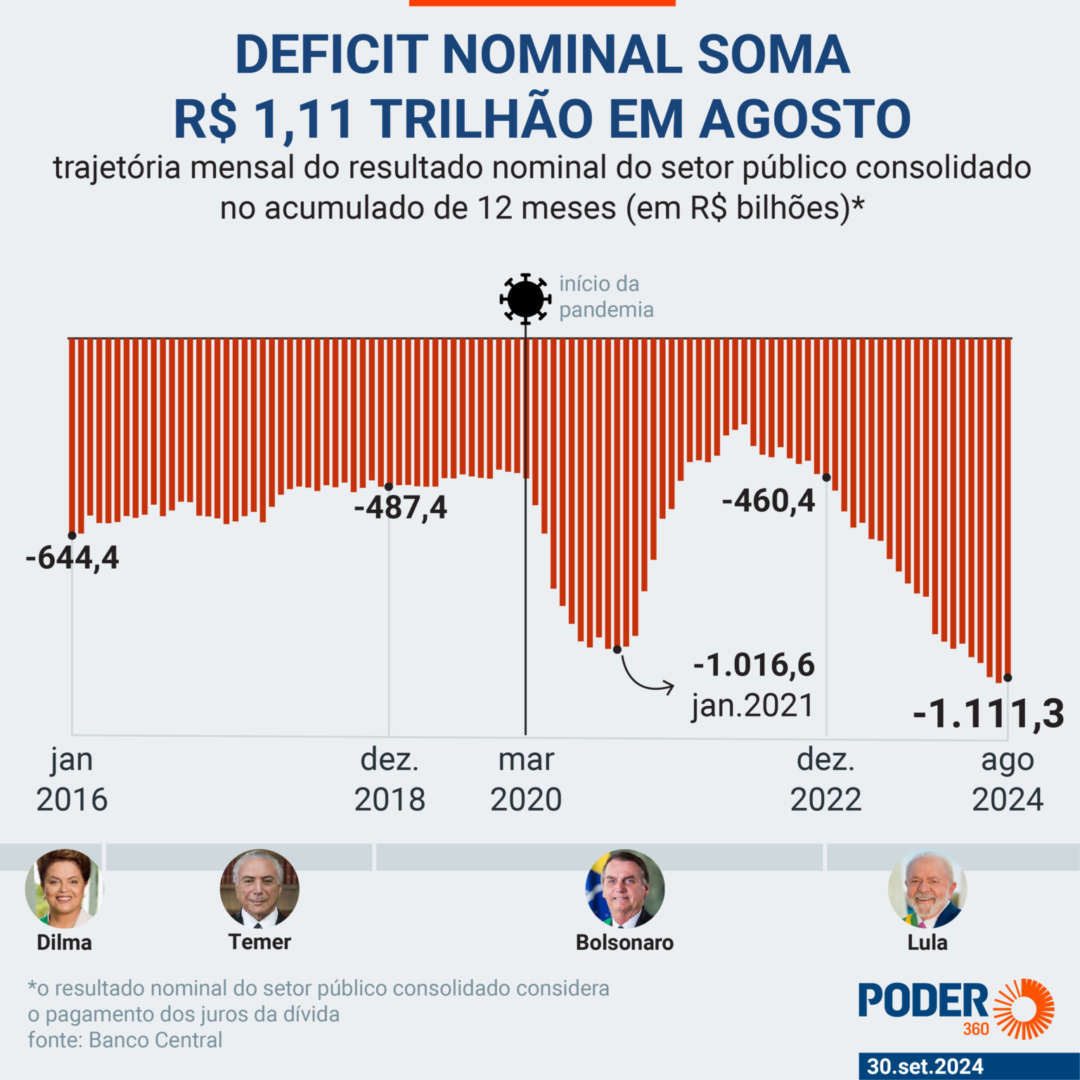 O resultado do setor público consolidado corresponde ao saldo entre as receitas e as despesas e considera também os gastos com os juros da dívida. Segundo o BC, o deficit nominal ficou acima de R$ 1 trilhão pelo 5º mês seguido no acumulado de 12 meses.
