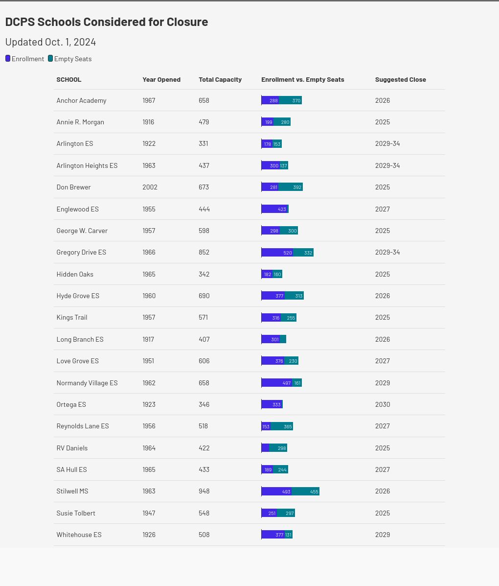 No ano passado, enquanto lidavam com atrasos na construção da nova Southside Estates Elementary, os administradores distritais perceberam que já não podiam pagar o Plano Ousado e voltaram à prancheta. Um consultor avaliou as escolas do distrito e criou uma lista de cerca de 30 que sugeriu que fossem encerradas.