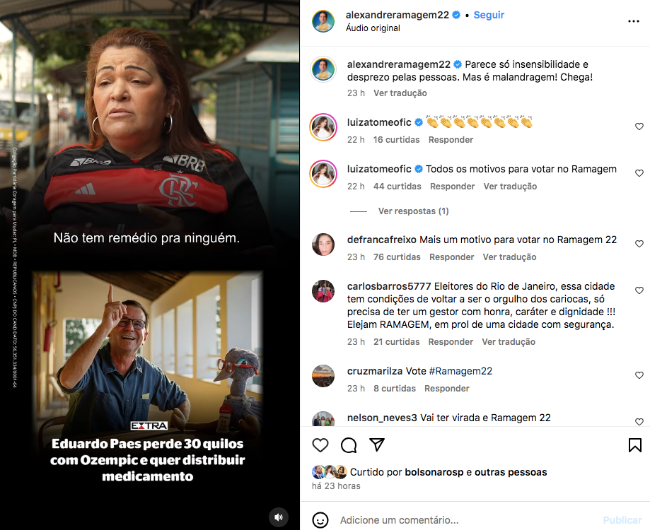 Na legenda da postagem, Ramagem classificou a declaração do prefeito como “malandragem” e recebeu o apoio de seus seguidores