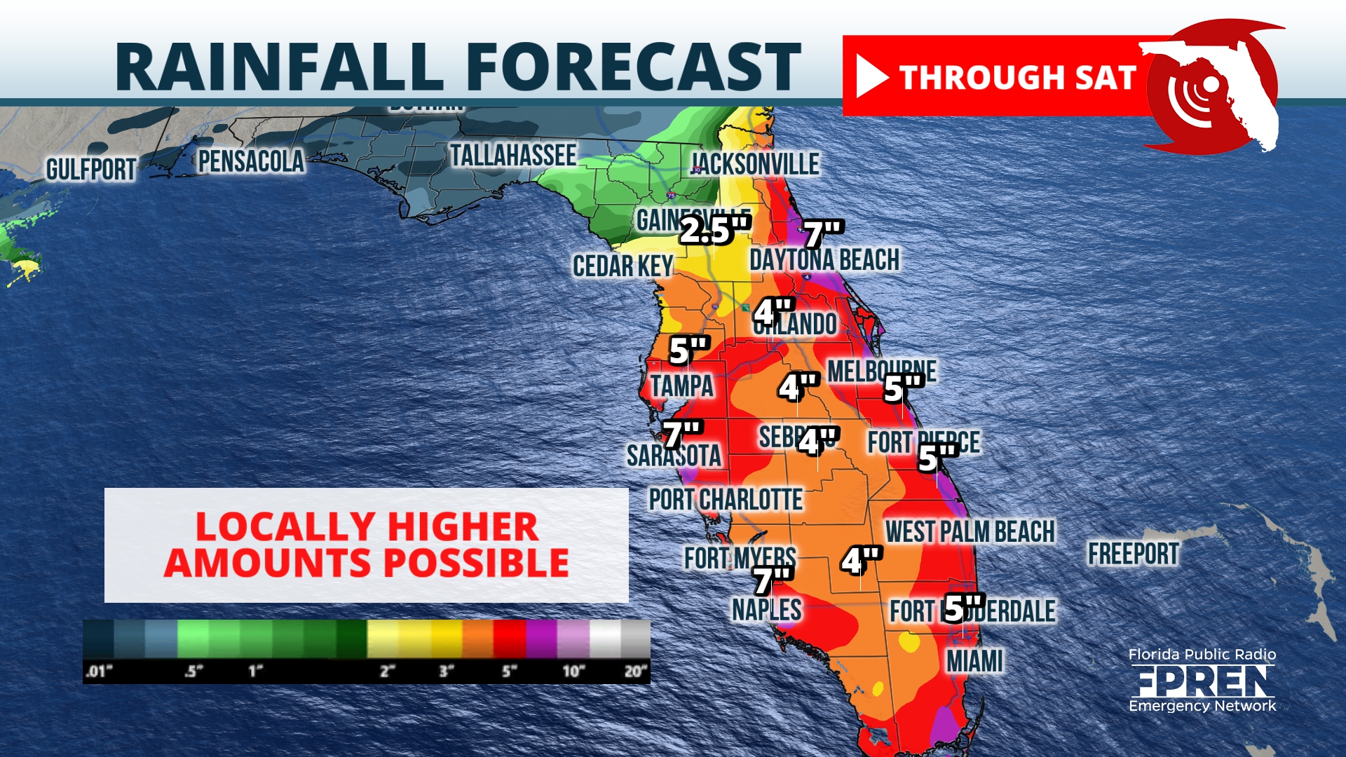 Chuvas fortes são esperadas na metade sul da península da Flórida esta semana. A previsão preliminar de chuva para o sábado seguinte está entre 4 e 8 polegadas para locais ao longo e ao sul da Interestadual 4 e para a costa atlântica imediata. São esperados 5 a 7 centímetros de chuva na área de Jacksonville, com base na previsão de sábado. A previsão provavelmente mudará nos próximos dias, mas o tema geral permanecerá consistente: chuvas fortes em partes da península representarão uma ameaça crescente de inundações repentinas na próxima semana. Os meteorologistas esperam que pelo menos ventos tempestuosos em terra no nordeste da Flórida se fortaleçam de terça a quarta-feira, de acordo com o Serviço Meteorológico Nacional em Jacksonville. Prevê-se a deterioração das condições costeiras e marinhas e inundações das marés, especialmente na bacia do rio St. A quantidade de chuva dependerá exatamente de onde a tempestade cruzar a Flórida, disse o Serviço Meteorológico. Árvores e galhos já enfraquecidos de Helene podem causar danos adicionais às árvores, diz a previsão.