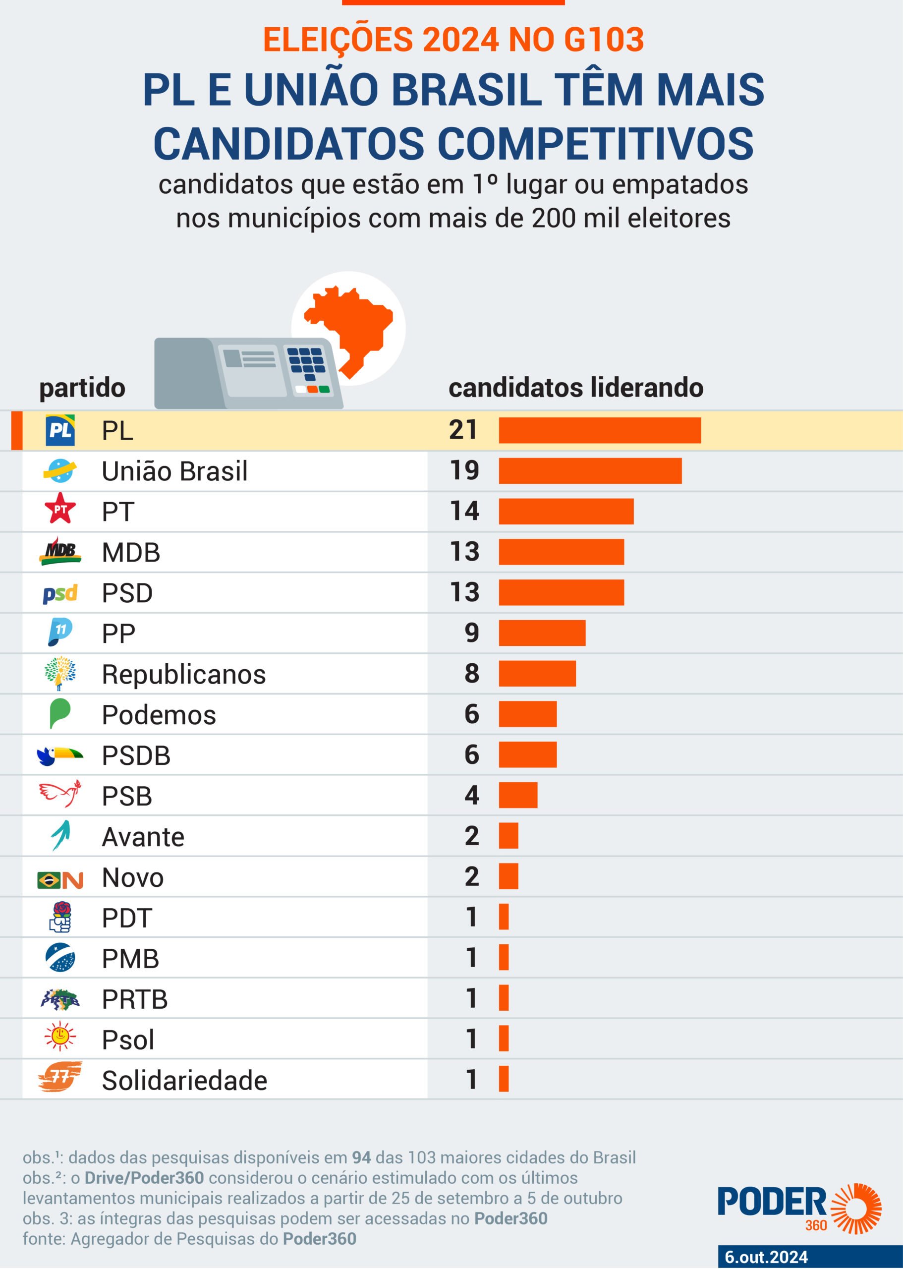 As legendas acumulam, respectivamente, 21 e 19 filiados em 1º lugar ou empatados nessa posição dentro da margem de erro nas pesquisas mais recentes disponíveis em 94 dos 103 municípios com mais de 200 mil eleitores, o chamado G103. Em 9 dessas 103 cidades não há estudos de intenção de voto registrados no TSE e com dados confiáveis divulgados nos últimos 10 dias.