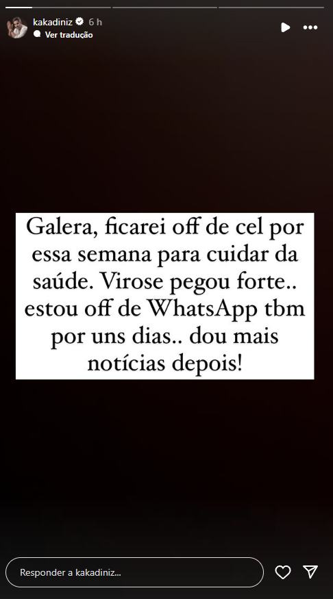 Em uma declaração nos stories do Instagram, Kaká foi direto ao ponto: “Galera, ficarei off de celular por essa semana para cuidar da saúde. Virose pegou forte. Estou off de WhatsApp também por uns dias. Dou mais notícias depois”. A mensagem foi clara e mostrou a seriedade com que está tratando a situação. Até o fechamento desta matéria, mais detalhes sobre seu estado de saúde não foram divulgados.