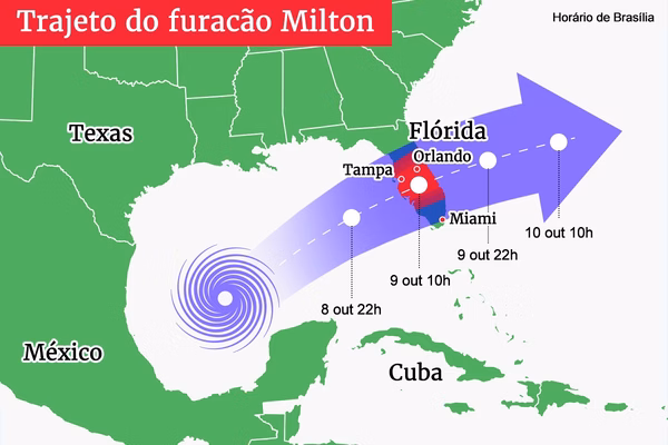 O furacão Milton está se encaminhando em direção à Baía de Tampa, na Flórida, Estados Unidos, e, atualmente, sua categoria é 4. Meteorologistas dizem que o furacão pode chegar ao estado com a categoria 5, nível considerado “catastrófico” pela Administração Oceânica e Atmosférica Nacional dos EUA (Noaa).