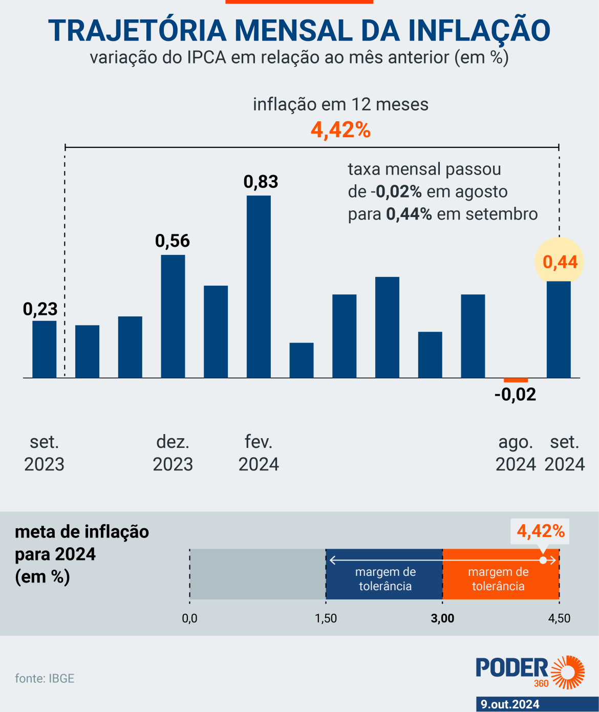Medida pelo IPCA (Índice Nacional de Preços ao Consumidor Amplo), a inflação oficial do Brasil foi de 0,44% em setembro. Havia registrado deflação de 0,02% em agosto. A inflação acumulada em 12 meses acelerou de 4,24% para 4,42%. O IBGE (Instituto Brasileiro de Geografia e Estatística) divulgou o resultado nesta 4ª feira (9.out.2024).