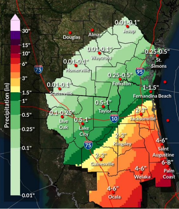 Ventos com força de tempestade tropical de pelo menos 39 mph são esperados no nordeste da Flórida na noite de quarta-feira. Chuvas de 1 a 8 polegadas são possíveis até quinta-feira à noite, com potencial para inundações repentinas.
