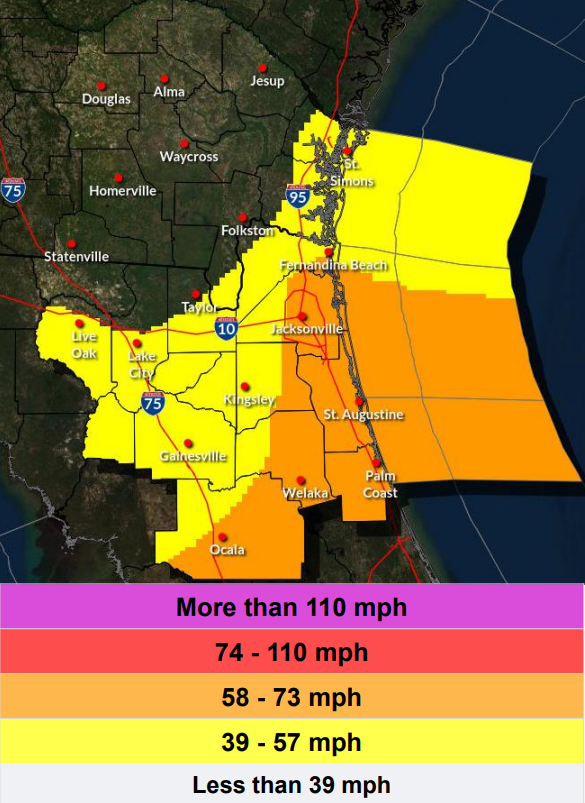 No nordeste da Flórida, o Serviço Meteorológico Nacional disse que ventos de 58 a 73 mph são possíveis em Jacksonville e ao sul no condado de St.