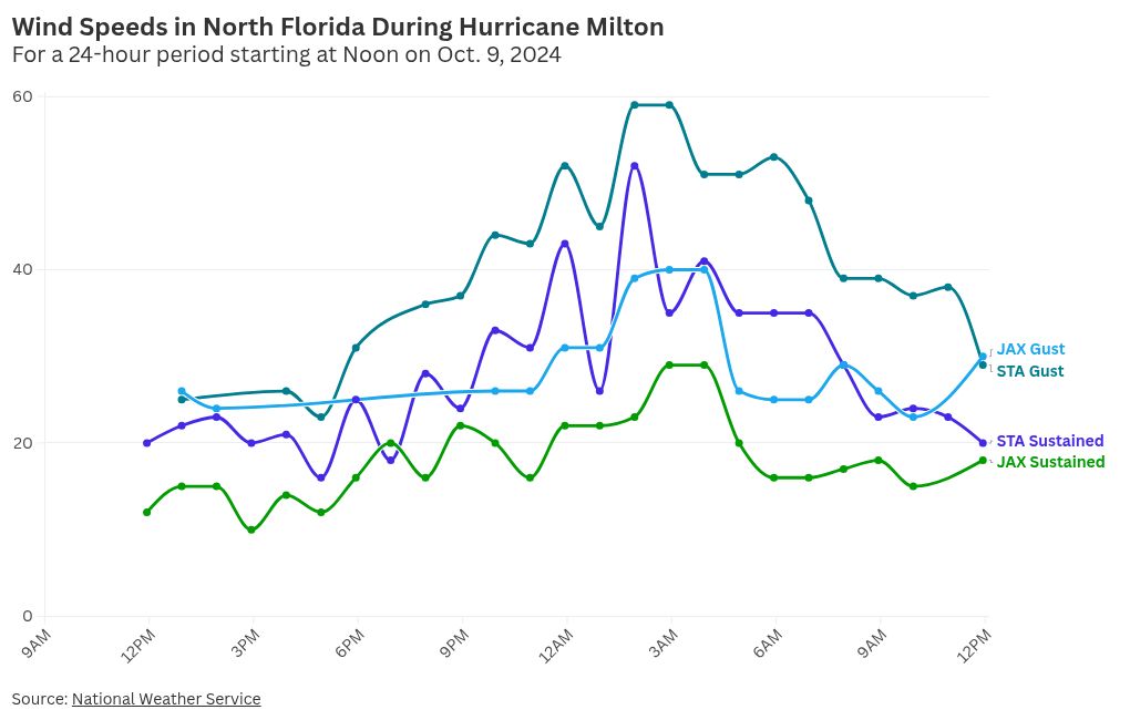 Depois que Milton entrou no Atlântico na quinta-feira, o rio St. atingiu o pico de pouco mais de 14 pés na estação de monitoramento do USGS perto da Ponte Acosta no centro de Jacksonville. Esse é um nível recorde para 10 de outubro – e mais de 60 centímetros acima da média.