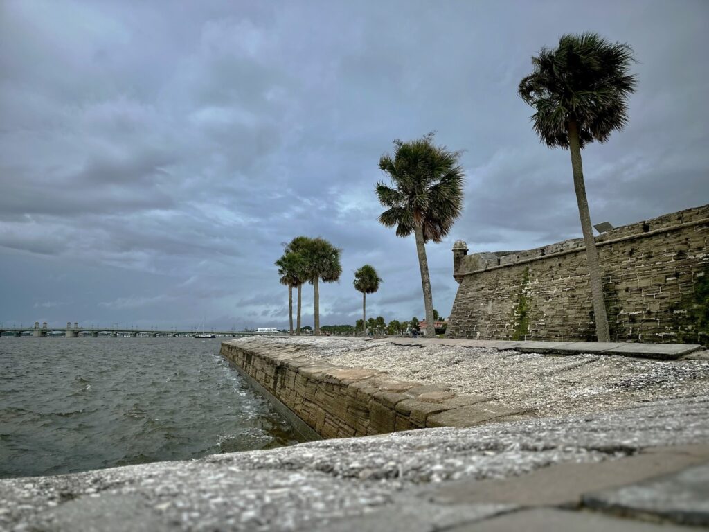 O furacão Milton causou inundações no estacionamento dos escritórios do parque ao longo da Avenida San Marco, bem como no gramado norte do Castillo. As ondas impactaram o próprio forte, então eles tiveram que inspecionar ele e os serviços públicos de Castillo, disse o superintendente do parque Gordon Wilson.