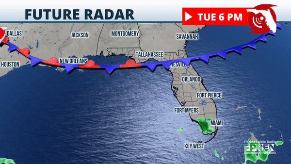 A frente fria perdeu energia e se espalha pela Flórida Central. Mas está ligado a outro sistema de baixa pressão que atravessa a porção norte do Golfo do México. Este trará a próxima frente fria, trazendo ar mais frio e seco com energia suficiente para percorrer o estado.