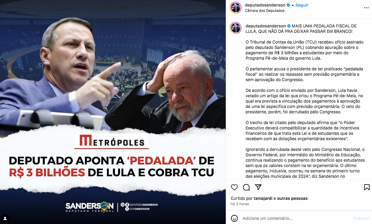 Um ofício assinado pelo deputado federal Sanderson (PL-RS) foi recebido pelo Tribunal de Contas da União (TCU). O parlamentar cobra explicações em função do pagamento de R$ 3 bilhões a estudantes por meio do Programa Pé-de-Meia do governo Lula (PT).