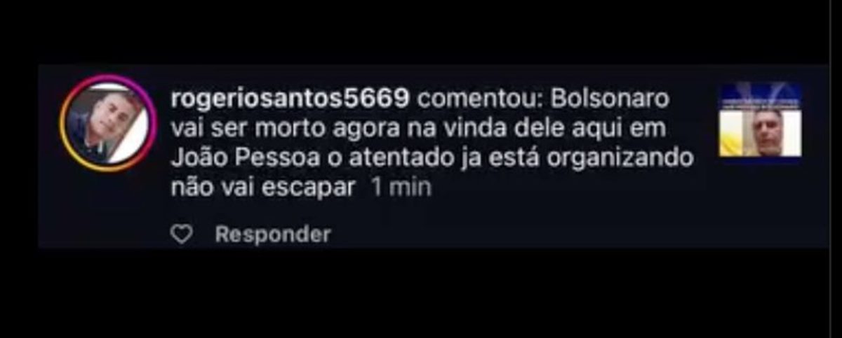 O perfil, identificado como Rogerio Santos, postou a seguinte mensagem na rede social: “Bolsonaro vai ser morto agora na vinda dele aqui em João Pessoa o atentado já está organizando não vai escapar