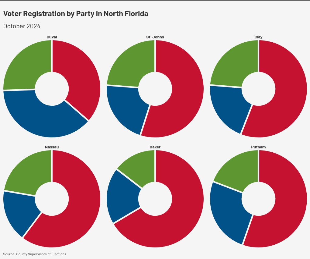 Os democratas têm uma pequena vantagem no condado de Duval – cerca de 11 mil a mais que os republicanos. Os republicanos lideram em cada condado ao redor de Duval. E os eleitores sem filiação partidária ou com filiação partidária menor também constituem um bloco significativo de eleitores.