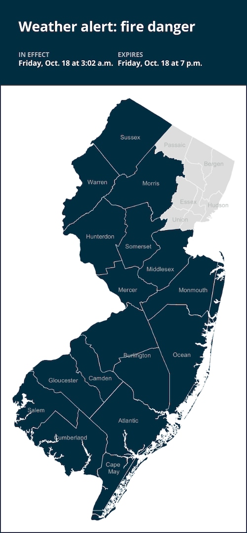 Um alerta meteorológico foi emitido pelo Serviço Meteorológico Nacional na sexta-feira às 3h02 para perigo de incêndio até as 19h para Sussex, Warren, Morris, Hunterdon, Somerset, Middlesex, Monmouth, Mercer, Salem, Gloucester, Camden, Burlington, Ocean, Condados de Cumberland, Atlântico e Cape May.