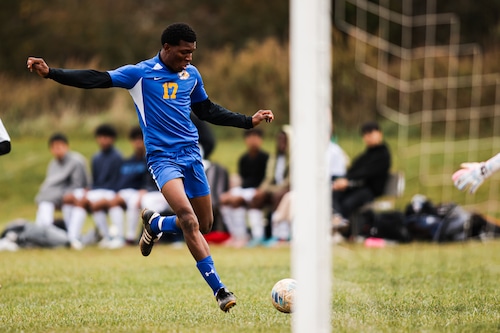 Chukwudi Raphael Mamah (17) de Timothy Christian chuta a gol durante o jogo de futebol masculino das quartas de final do NJSIAA Non-Public B entre Timothy Christian x Wardlaw-Hartridge na Timothy Christian School em Piscataway, NJ na terça-feira, 31 de outubro de 2023.Milha Djordjiovski | Para NJ Advance Media
