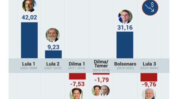 O deficit no governo Lula superou o registrado no 1º mandato do governo Dilma Rousseff (PT), quando houve um saldo negativo de R$ 7,53 bilhões a preços atuais. O saldo negativo reverte parte do superavit de R$ 31,16 bilhões obtido no governo Jair Bolsonaro (PL).