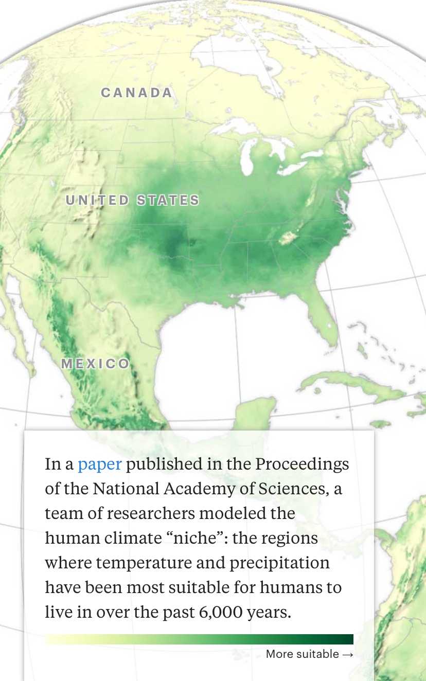 A ferramenta incorporada o artigo da ProPublica permite que as pessoas cliquem em qualquer condado dos EUA para ver como a habitabilidade humana daquele condado deverá mudar nos próximos 20 a 40 anos.