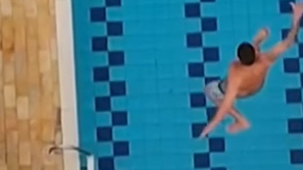 Esse é o momento exato em que o homem pula do segundo andar e cai na piscina. O que ele não esperava era que os policiais já tinham conseguido entrar no imóvel pelos fundos. Foram 40 minutos de negociação para que o suspeito se entregasse. O homem se rendeu e foi levado para a delegacia. Pouco antes disso tudo acontecer, ele tinha invadido um comércio da região. O suspeito vai responder pelos crimes de ameaça, posse ilegal de arma de fogo e invasão. Essa cena inusitada aconteceu na cidade de Cerquilho, no interior de São Paulo.