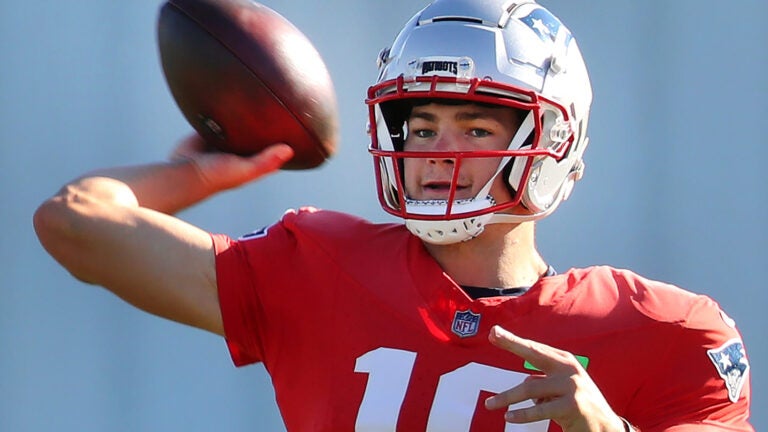 Drake Maye dispara um passe durante um exercício. John Tlumacki/Equipe do Globo