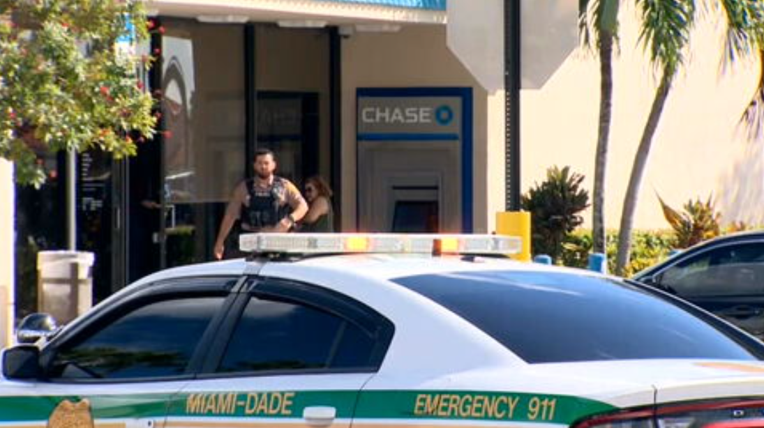 Unidades da Polícia de Miami Dade responderam à filial do Chase na área da Northwest 97th Avenue e West Flagler Street, na tarde de sábado.