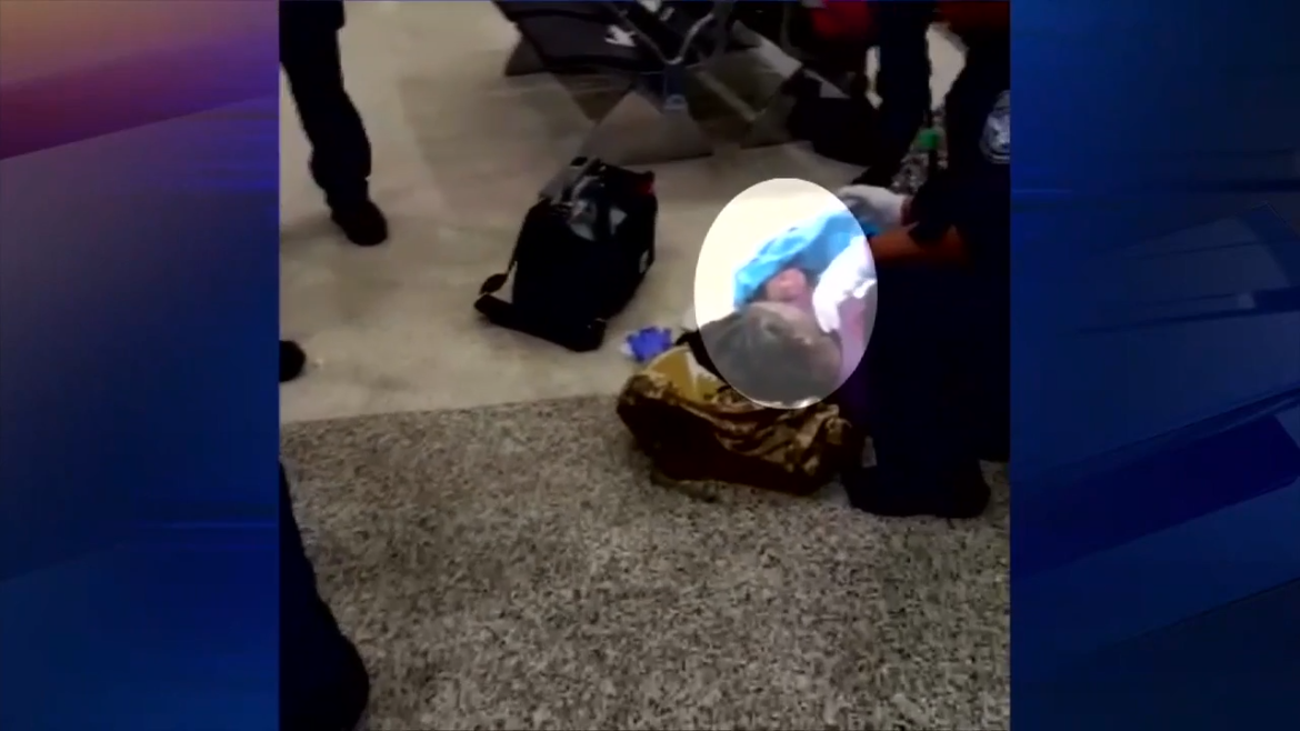 A bolsa da passageira estourou e ela começou a dar à luz perto do Posto de Controle 1, na área de pré-segurança.