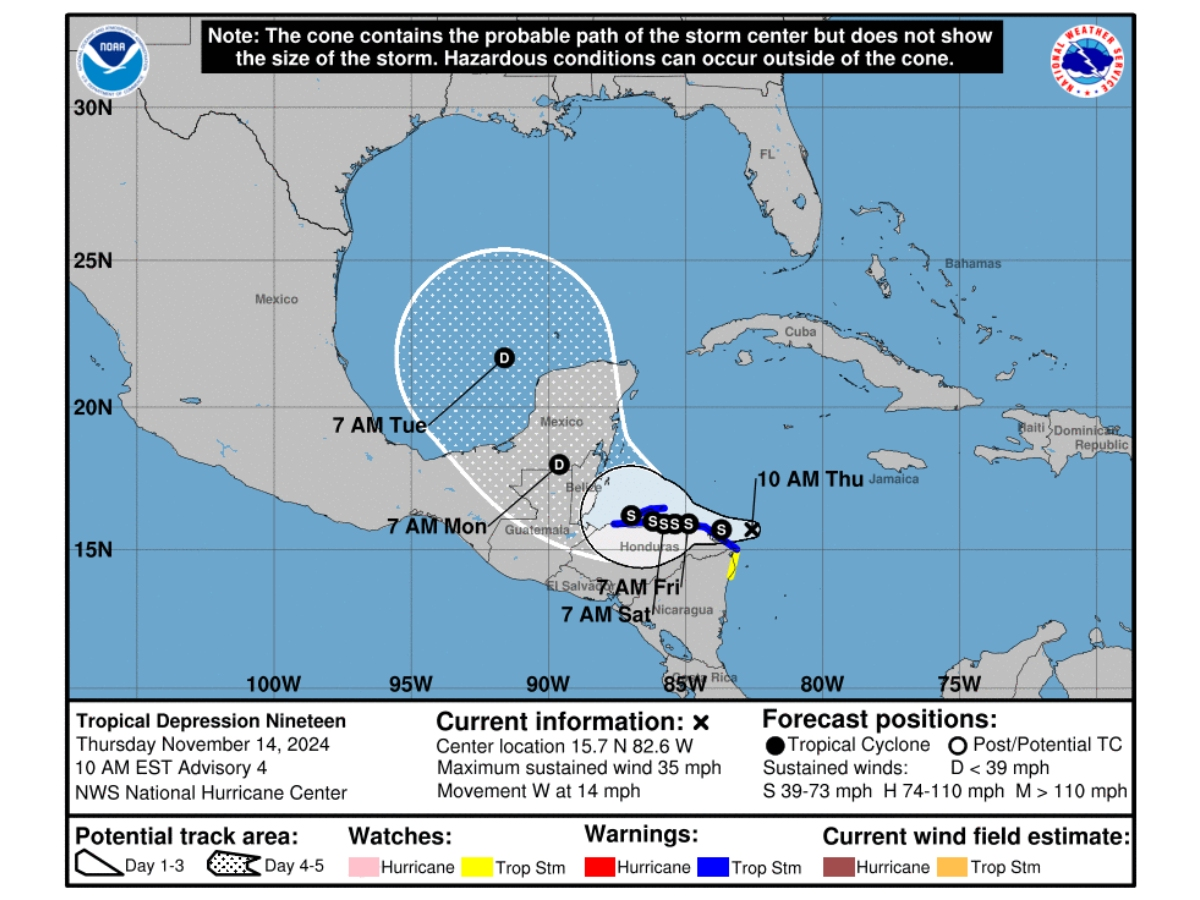 Estava a cerca de 250 milhas a leste da Isla Guanaja, Honduras, movendo-se para oeste a 15 mph com ventos máximos sustentados de 35 mph, o Weather Channel relatou.