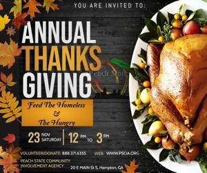HAMPTON – Voluntários e doações são necessários para que o Dia de Ação de Graças Anual da Agência de Envolvimento Comunitário do Estado de Peach alimente a refeição faminta no sábado, 23 de novembro, do meio-dia às 15h, no Hampton Train Depot, 20 E. Main St.