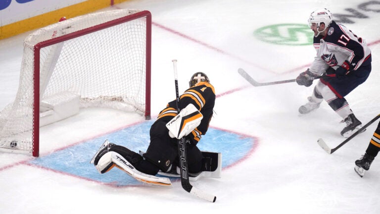 O ala direito do Columbus Blue Jackets, Justin Danforth, marca contra o goleiro do Bruins, Jeremy Swayman, durante o terceiro período. Foto AP/Charles Krupa