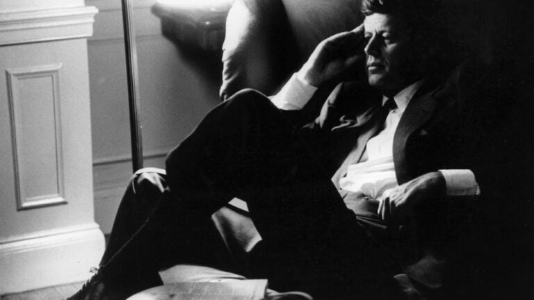 O senador John F. Kennedy está sentado em seu apartamento na Bowdoin Street, em Boston, em 17 de maio de 1957. Revista LOOK, Biblioteca e Museu Presidencial Douglas Jones/John F. Kennedy