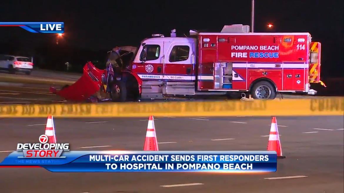 PRAIA DE POMPANO, FLA. (WSVN) – Cinco pessoas foram levadas ao hospital, incluindo três bombeiros, após se envolverem em um violento acidente em Pompano Beach, disseram as autoridades.