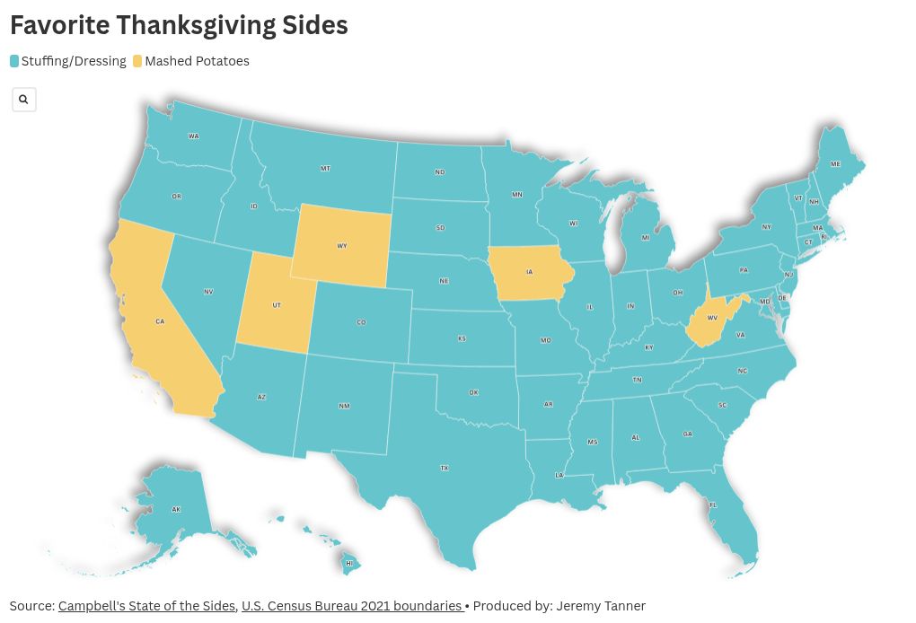 Recheio ou molho, dependendo de onde você moradomina o mapa com apenas alguns estados coroando o único concorrente, o purê de batata, como o principal time do Dia de Ação de Graças. Isso inclui Califórnia, Utah, Wyoming, Iowa e Virgínia Ocidental. No ano passado, o purê de batata ficou em primeiro lugar no ranking nacional.