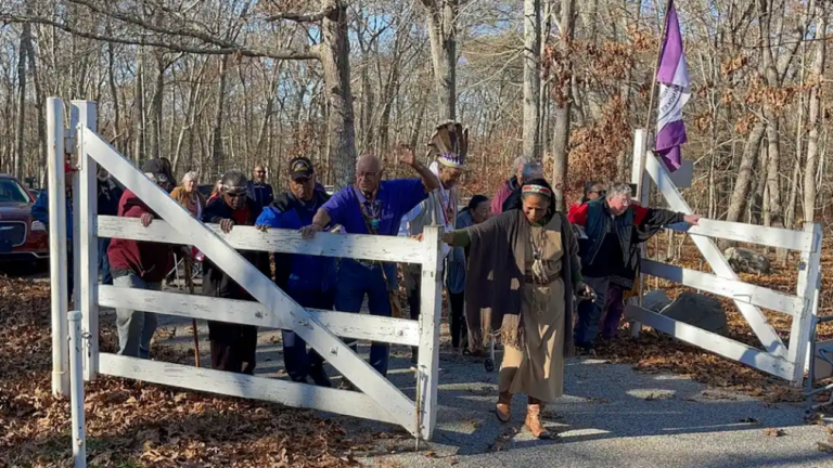 Membros da tribo indígena Pokanoket, liderada por Sachem Dancing Star, abriram o portão para um local de 255 acres em Bristol, RI, no domingo, depois que a Brown University transferiu a terra para um fundo tribal. Cortesia de Sachem Dancing Star