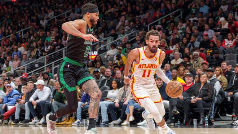 Trae Young dirige na pista enquanto é guardado por Jayson Tatum durante um jogo em Atlanta, 4 de novembro de 2024. Foto AP / Jason Allen