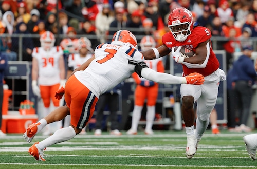 O running back Kyle Monangai (5) de Rutgers rompe o tackle do zagueiro Matthew Bailey (7) de Illinois durante a primeira metade do jogo de futebol Big Ten entre Rutgers e Illinois no SHI Stadium em Piscataway, NJ em 23/11/24 . Chris Faytok | NJ Advance Media para NJ.com