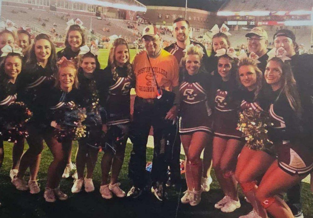 O superfã do BC, Ron Saloman, 91, posa com a torcida do BC antes de um jogo de futebol em casa dos Eagles. – Cortesia da Família Saloman