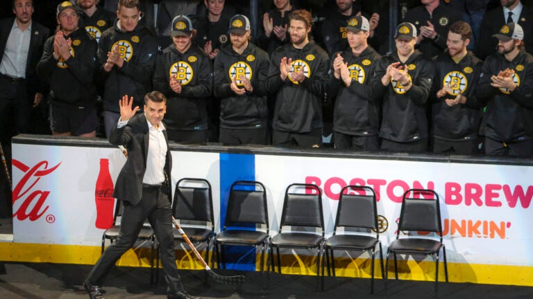 Patrice Bergeron foi homenageado na cerimônia de domingo no TD Garden. Foto de Matthew J Lee/equipe da Globe