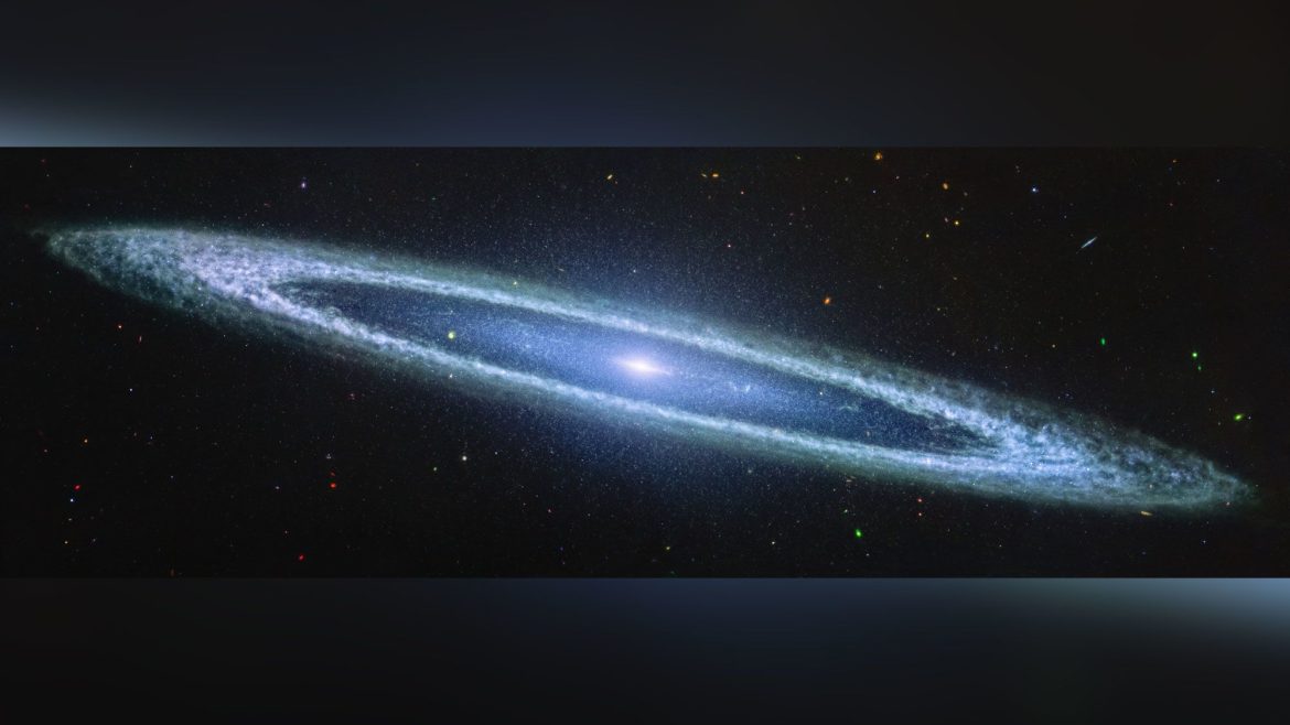 Tirada com o instrumento Mid-Infrared do observatório espacial, ou MIRI, a imagem mostra o disco interno liso da galáxia, em vez do núcleo brilhante que normalmente brilha em imagens de luz visível tiradas com o Telescópio Espacial Hubble. A visão de Webb torna a “coroa” do sombrero invisível, mudando a aparência da galáxia para se assemelhar a um alvo. Enquanto isso, galáxias distantes brilham no fundo da imagem.