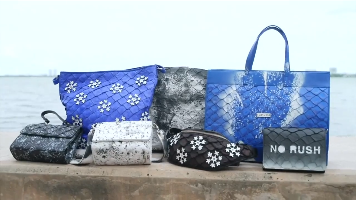 Gustavo Oviedo: “Vejo cada bolsa como uma tela para este projeto. São peças únicas; cada um é único. Os que estou usando são feitos de pele de peixe.”