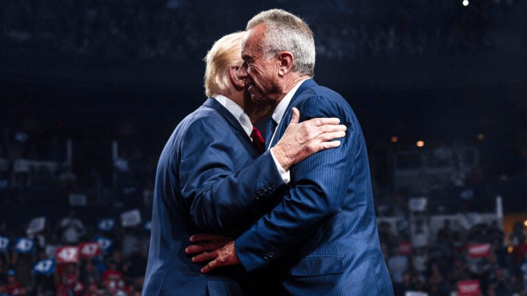 O ex-presidente Donald Trump, então candidato republicano à presidência, abraça Robert F. Kennedy Jr. em um comício de campanha em Glendale, Arizona, em 23 de agosto de 2024. Adriana Zehbrauskas/The New York Times