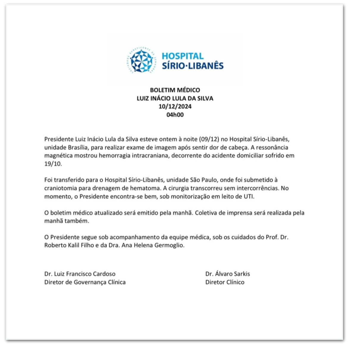 “O presidente Luiz Inácio Lula da Silva esteve ontem à noite no Hospital Sírio-Libanês, unidade Brasília, para realizar exame de imagem após sentir dor de cabeça. A ressonância magnética mostrou hemorragia intracraniana, decorrente do acidente domiciliar sofrido em 19 de outubro.