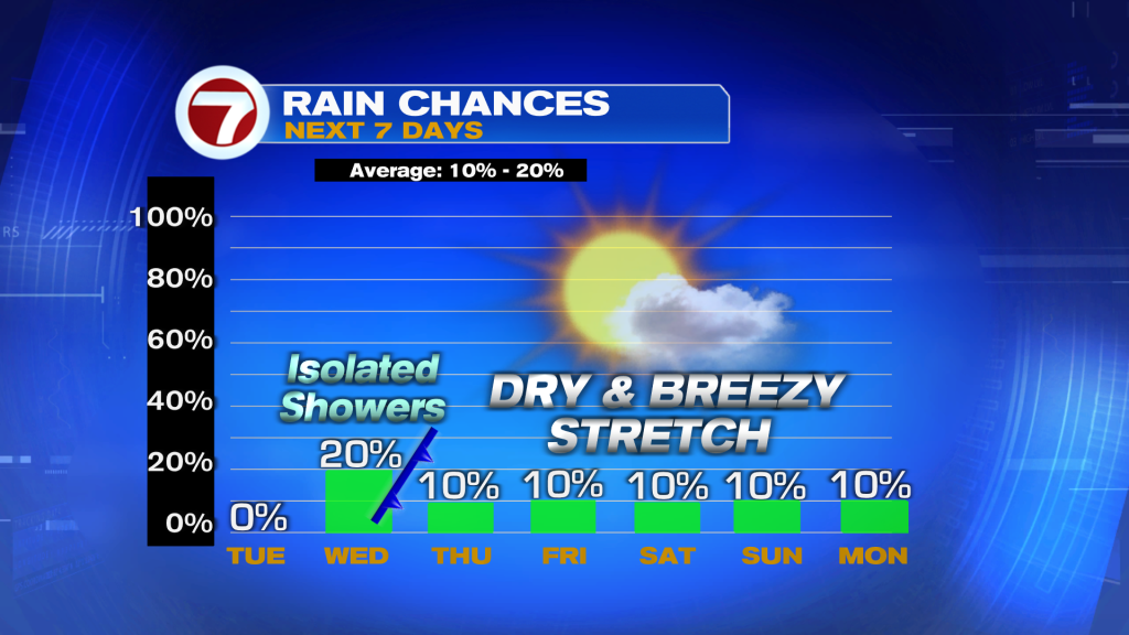 Uma tendência de aquecimento está em curso à medida que acompanhamos a próxima frente fria. Os modelos que mostram isso cruzarão a noite de quarta-feira, trazendo apenas uma pequena chance de ver algumas chuvas no final do dia. A previsão é de que os ventos aumentem rapidamente vindos do Norte à noite, ajudando a queda das temperaturas.