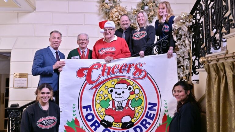 Na linha superior a partir da esquerda, Markus Ripperger, presidente e CEO da Hampshire House e Cheers Boston; Bill Connolly, Diretor Executivo do Globe Santa; e Thomas Kershaw, proprietário da Cheers Boston, estão com a equipe da Cheers e da Hampshire House enquanto presenteiam o Globe Santa com US$ 10.000 para ajudar a comprar presentes para crianças carentes. Cheers Boston e Hampshire House doaram US$ 541.127 ao Globe Santa desde 1980. Josh Reynolds para o Boston Globe
